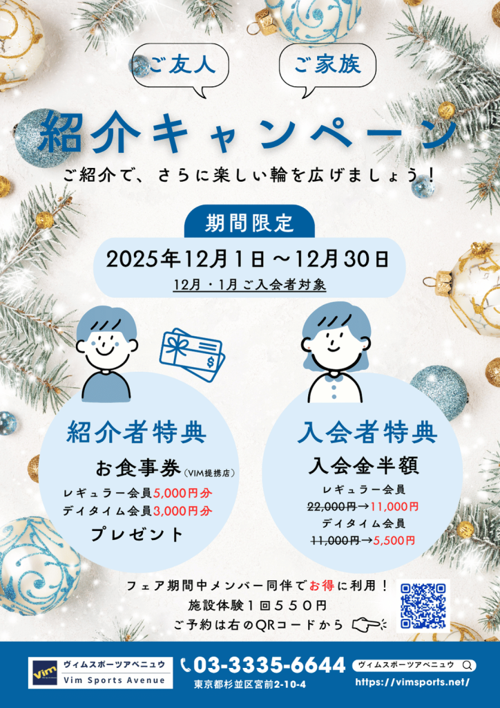 投稿日 2025/11/20 カテゴリー お知らせ(スポーツクラブ) ご友人、ご家族と運動を始めるチャンス! 期間限定の紹介キャンペーンで紹介者にはお食事券、入会者には入会金半額の特典をご用意✨ この機会にぜひお越しください!